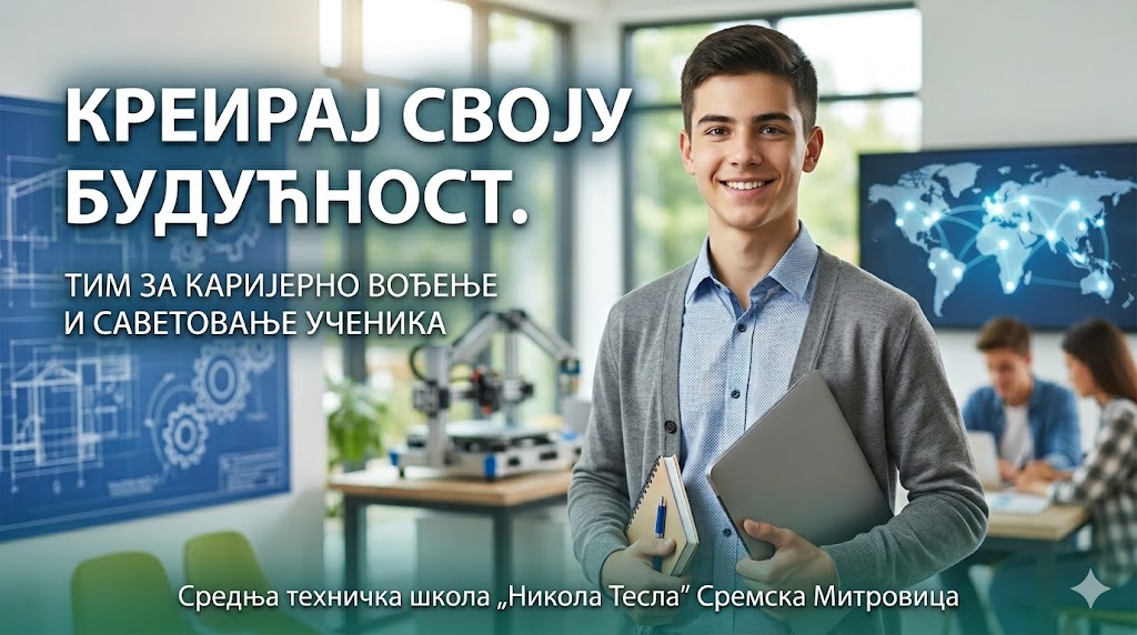 Добродошли на страницу посвећену твом професионалном развоју и грађењу твоје успешне будућности! У Средњој техничкој школи „Никола Тесла“ верујемо да твој пут не почиње и не завршава се само са стицањем дипломе, већ је то једно узбудљиво путовање на којем те ми подржавамо, инспиришемо и водимо кроз доношење кључних одлука. Ова страница је креирана са циљем да ти пружимо све потребне ресурсе, информације и подршку како би ти, уз своју посвећеност, стекао неопходне вештине за савремено тржиште рада.
